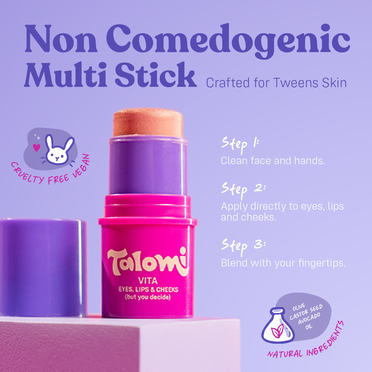 Every tween and teen deserves makeup that's as unique as they are. That's why Vita Makeup Sticks are designed to enhance your natural glow and let your personality sparkle. With just a few easy strokes, you can create a look that's all you – playful, vibrant, and full of joy.